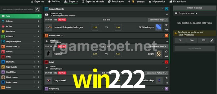 O win222 oferece uma grande seleção de opções de apostas em e-sports com probabilidades competitivas